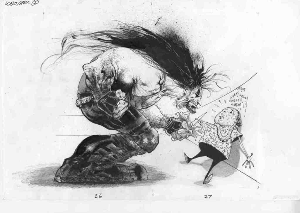 Another great—Sam Keith, of The Maxx fame. Keith only draws what he wants to draw—the first four issues of The Sandman are a lot uglier than they needed to be except for the one issue that takes place in Hell—but when he actually gets into a groove (as, obviously, he has done in this sketch), he’s the best of the best. Also, I like Lobo. I realize he’s kind of silly, but that’s why I like him.