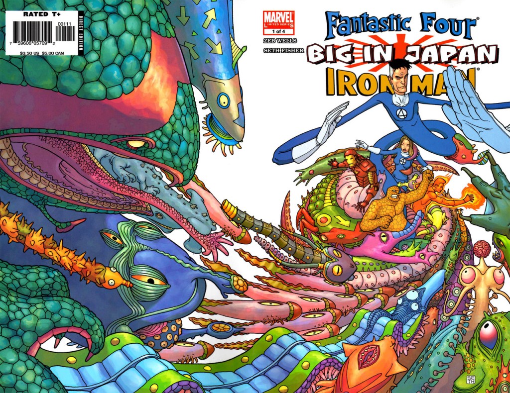 Last one for the evening: a Fantastic Four/Iron Man cover by the late, great Seth Fisher. Fisher died under really tragic circumstances a few years ago; he was unquestionably one of the finest artists of the younger generation and there are only a few examples of his beautiful, utterly strange work, but they are to be treasured.