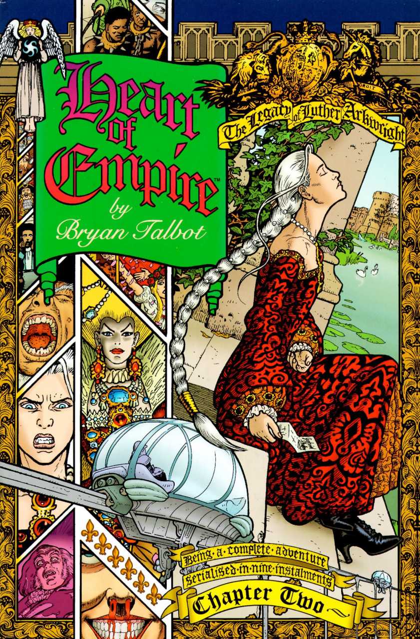 It’s been a while since I posted some old-fashioned comic art, so here’s a particularly good cover from Bryan Talbot’s magnificent character-driven sci-fi extravaganza, Heart of the Empire. HotE is a sequel to The Adventures of Luther Arkwright, a much more experimental and weird book, but it stands alone both as a solo work and in the annals of comics history so far as I’m concerned. Talbot’s an incredibly gifted draftsman as you can see here but no single page or spread is going to give you an idea of the breadth of the story, in which the Restoration has come centuries late and Glorianna is a terrifying, vampire-like monster.